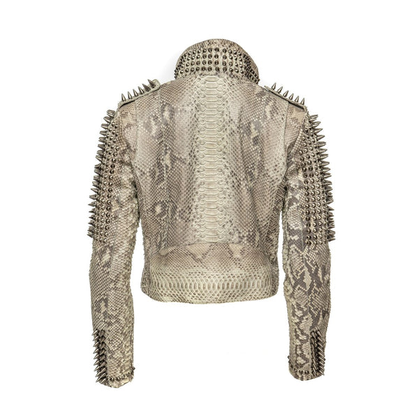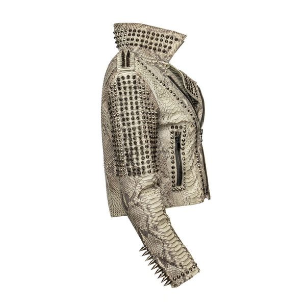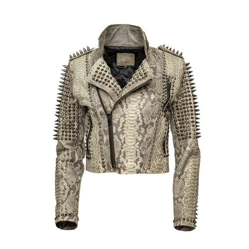 Chaqueta de motociclista de piel de serpiente pitón con detalles metálicos